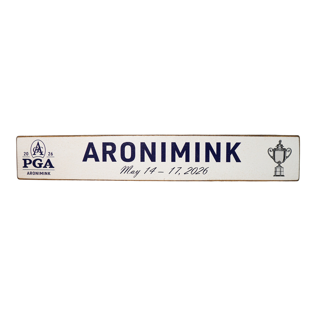 This weathered wood sign makes for great home or office décor for fans of the 2026 PGA Championship at Aronimink Golf Club. The printed design includes the 2026 logo, Aronimink text with event dates, and the Wanamaker Trophy.