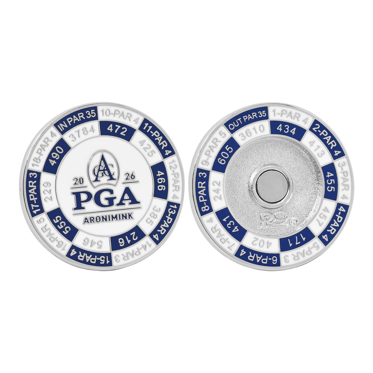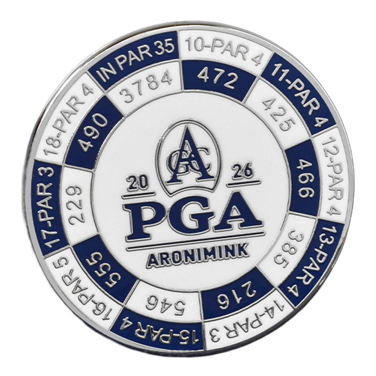 Get to know the course with this dual-sided, magnetic golf ball marker listing the hole-by-hole yardages and pars for Aronimink Golf Club. Packaged in clamshell packaging.