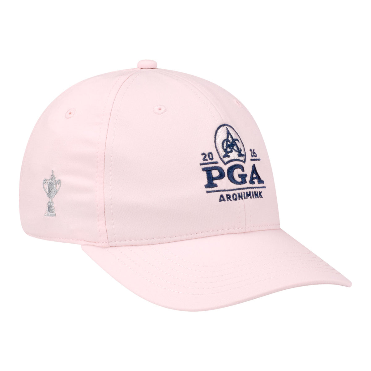 This unstructured, performance hat has the official 2026 PGA Championship logo embroidered on the front in navy and soft pink thread with the Wanamaker trophy embroidered on the side in grey thread. Adjustable women's fit.