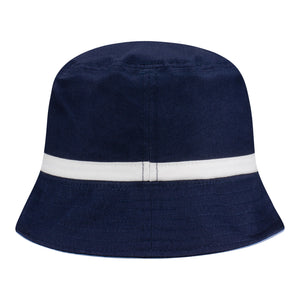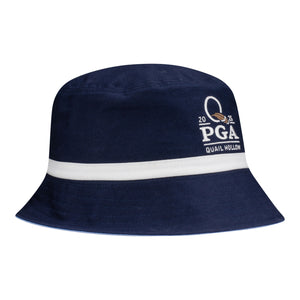 This reversible bucket hat has the 2025 PGA Championship logo on the navy side and reverses to Quail text in an upside down format on the light blue side.