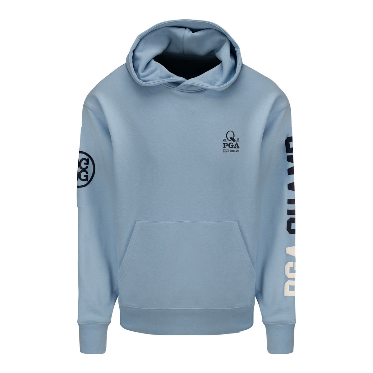 This light blue hoodie sweatshirt features the 2025 PGA Championship logo on the left chest, PGA CHAMP text down the left sleeve, and the GFore logo on the right sleeve.