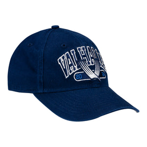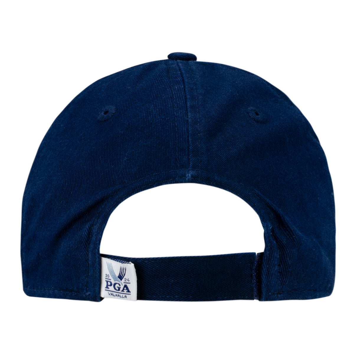 The 2024 PGA Championship Youth unstructured hat features embroidered Valhalla text in collegiate style with iconic logo and adjustable closure at the rear.